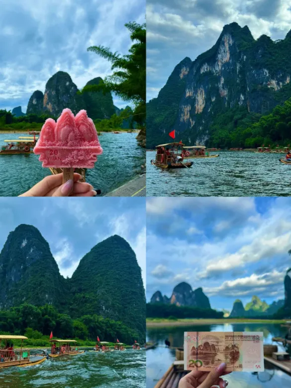 两江四湖的榕杉湖夜景璀璨,可免费漫步感受“千峰环野立”的意境。乘船或竹筏游览漓江(杨堤至兴坪段),欣赏九马画山与20元人民币背景图。