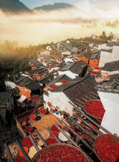 婺源的秋天,外地人总觉得是看红叶的,但真正懂婺源的人知道,婺源的秋不在山里,在村子里,在那些白墙黑瓦的徽派建筑和晒秋的场景里,你站在篁岭的观景台上,看到一家家屋顶上晒着红辣椒、黄玉米、橙南瓜,那种视觉冲击力不是风景照能表现出来的,是一种"生活本身就是风景"的状态。