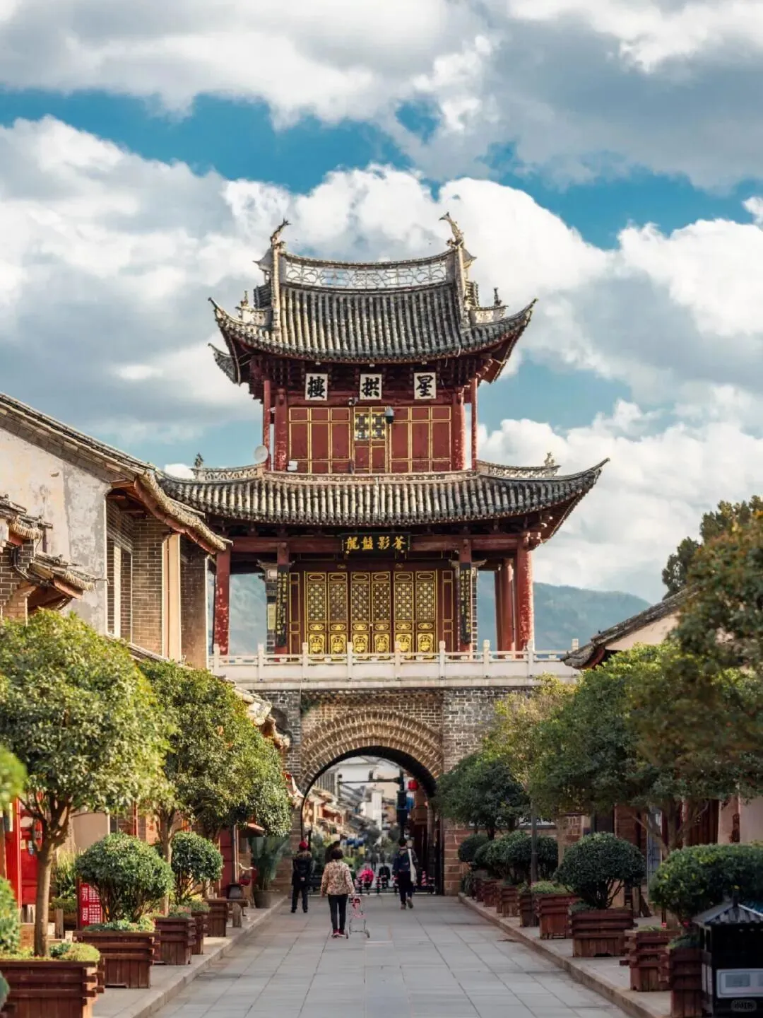 过拱辰楼的门洞, 一眼望穿整条南诏古街。太阳把影子拉得老长, 铺在干净的石板路上。