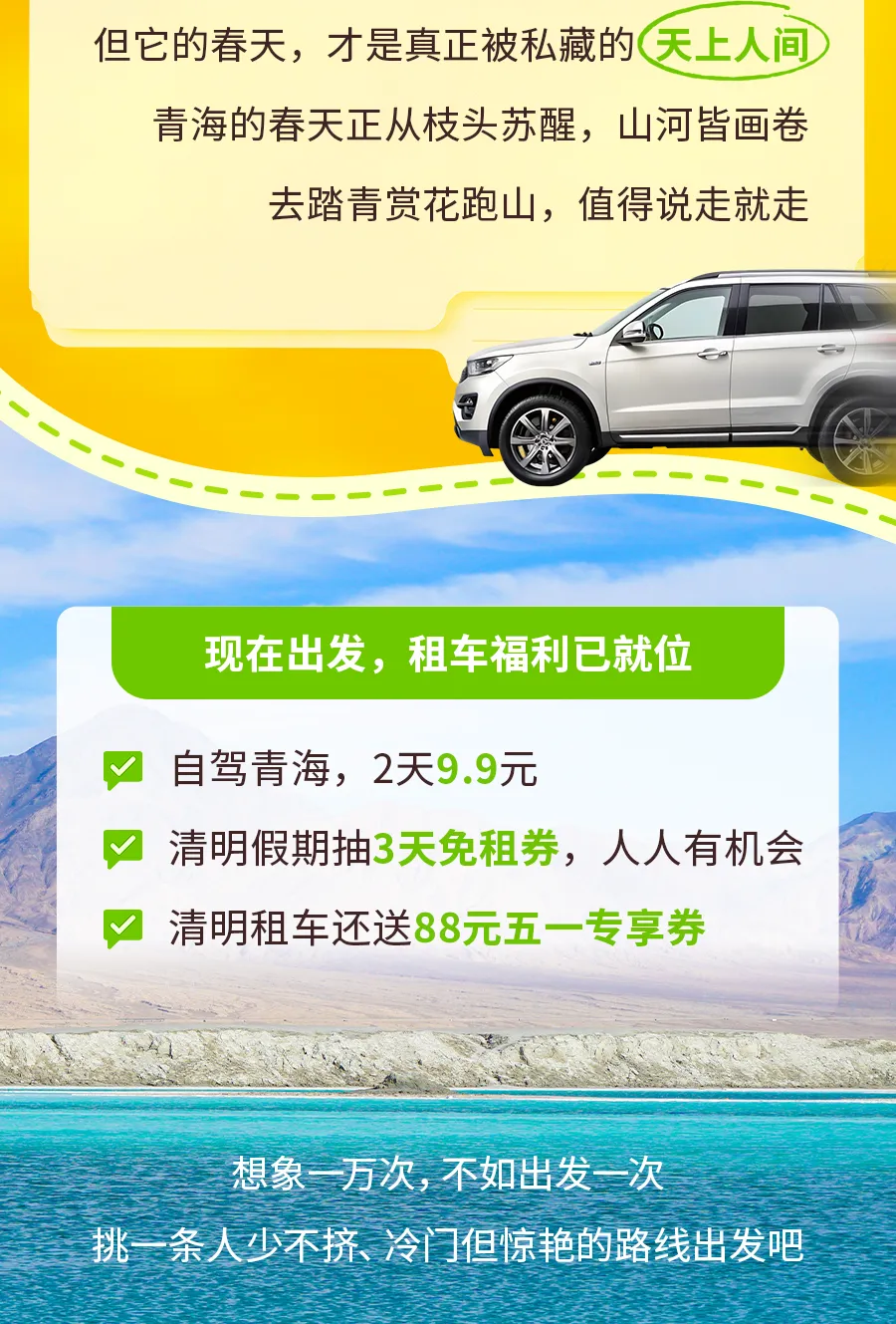 风景在路上,自由在车里。你的春日出游,神州租车为你保驾护航:抽3天免租券,清明假期租车还能获得五一的专享券。而且有10万辆新车可以选,春暖花开赶紧租辆车,去打卡青海美景吧~