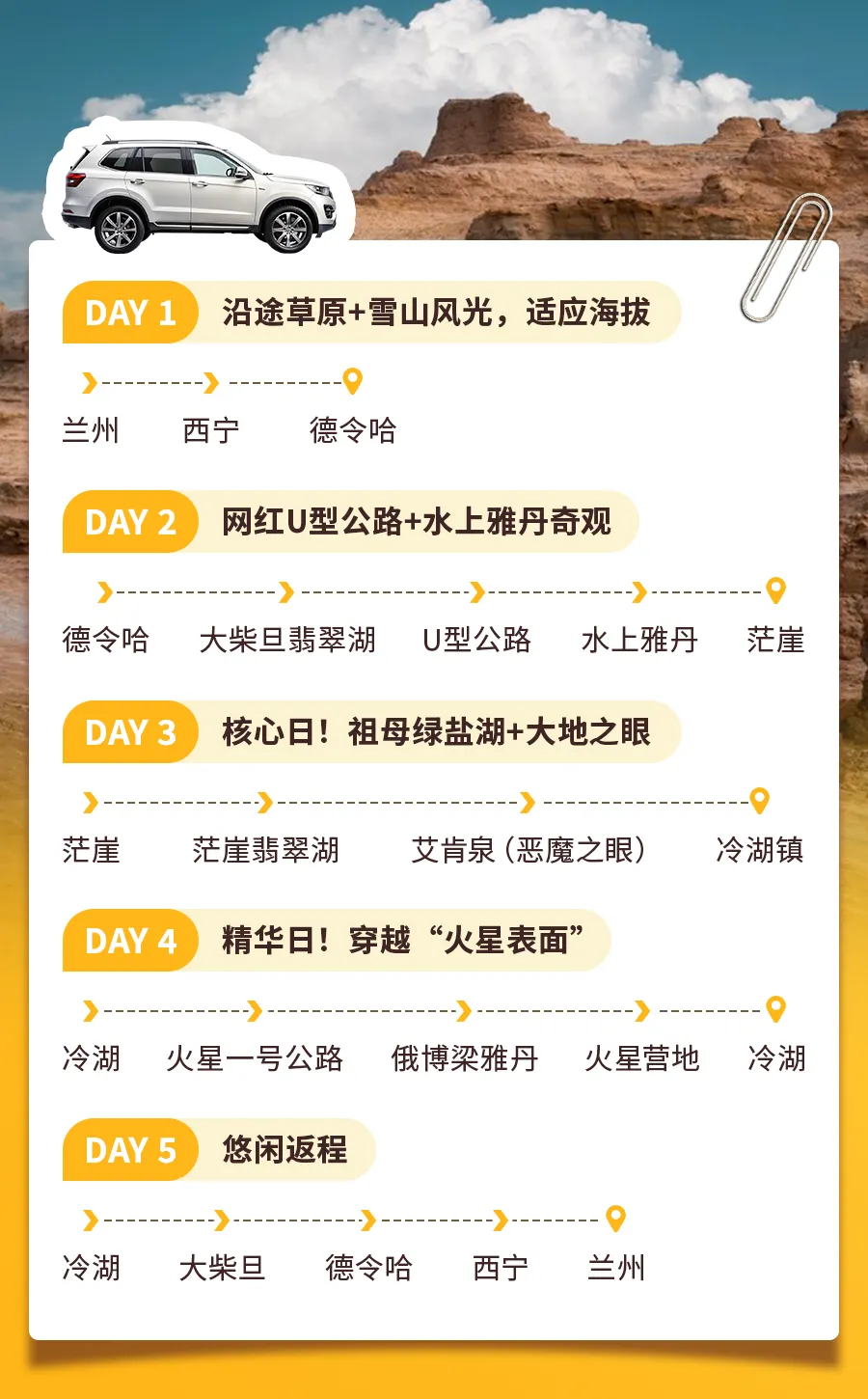 这条超过2000公里的环线,将柴达木盆地精华、超现实的景观串联起来。从晶莹剔透的盐湖,到诡谲神秘的水上雅丹;从通往天际的公路,到翻涌着大地脉搏的“恶魔之眼”;最终,抵达那片无人区的核心——真正的“火星”地表。每一天,地貌都在剧烈变换,感官将被持续震撼👀。