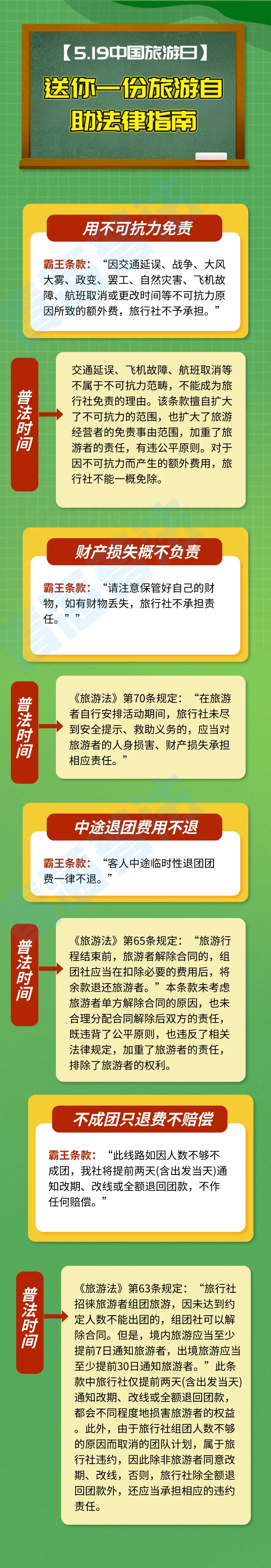 【普法课堂】送你一份旅游自助法律指南纵情于山水之间 寻觅难得的安宁 聆听着鸟语蛙声 走遍祖国的大好河山 旅行过程中 游客又该如何维权呢? 中国旅游日, 送你一份旅游自助法律指南 《旅游法》出台了以后, 旅游者的合法权益得到了保障, 但是仍有部分人在旅游时遭遇侵权 而不自知或不知道怎么解决 当!当!当!旅游法普法时间到了 遭遇“八大霸王条款”要怎么办 快来做笔记