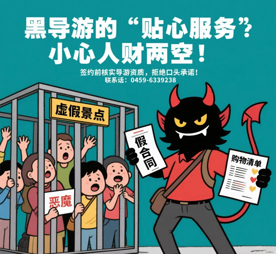 - 警惕“临时工”“志愿者”等模糊身份! ✅ 第二招:合同抠细节,口头承诺不算数! - 出团前必须签订旅游局备案的电子合同,不得出团后补签 - 重点核对:景点名称+停留时长、费用包含项、违约条款 - 拒绝签署“补充协议”“空白合同”! ✅ 第三招:保留证据,硬气维权! - 录音/录像记录导游威胁言行 - 保存购物小票、转账记录、聊天截图 - 维权请拨打0459-6339238举报,一键直达监管部门! Part 3:实用工具+法律撑腰 自查工具: - 导游资质查询:[全国旅游监管服务平台链接-https://mr.mct.gov.cn/] - 旅行社投诉记录:天眼查/企查查搜索 法律武器: - 《旅行社条例》第59条:禁止强制购物,违者最高罚50万! - 《导游人员管理条例》:无证导游最高可罚3万元! 你的旅行被黑导游坑过吗? 快来评论区分享经历,帮助更多人避雷! 转发这篇攻略到朋友圈,提醒家人朋友! 旅行不添堵,从拒绝黑导游、低价团开始!