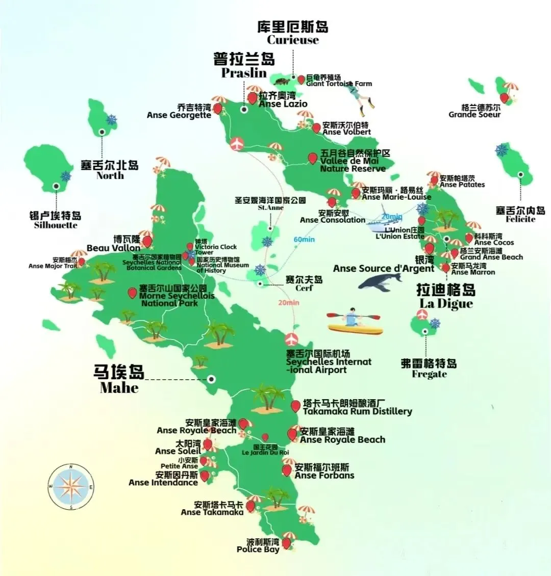 - 塞舌尔的机场不设置货币兑换处,用不完的卢比一定要在市区兑换好。