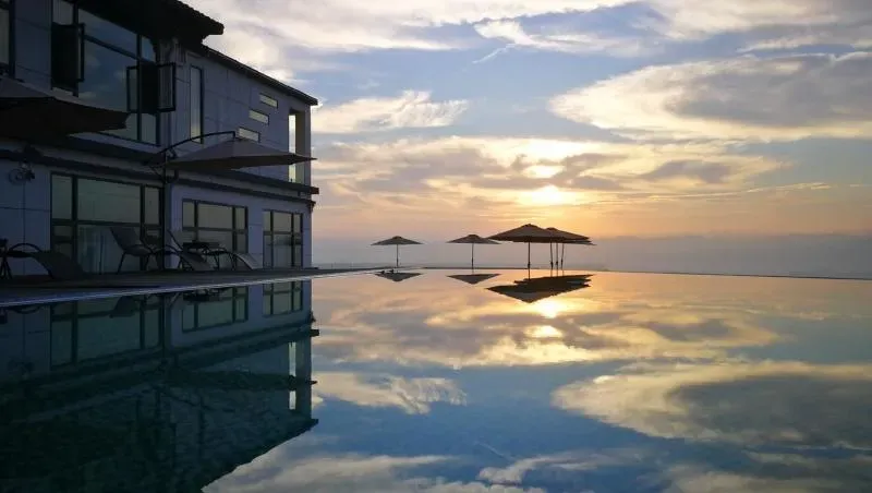 如果说宣恩夜景你还没看够,没关系,我们回恩施依山而居。一眼俯瞰恩施城全景,背靠着山,看日出云海,观落日余晖。作为独享整片山坡的民宿,公共空间也绝对的够奢侈,超大的庭院,融入山林的户外空间,无边际泳池让人些许有点期待。