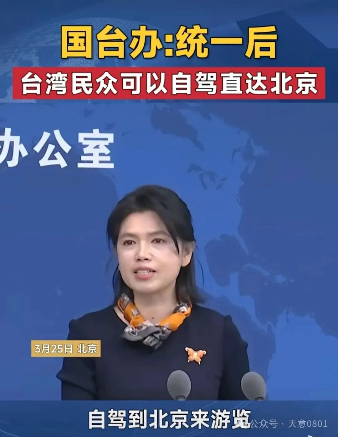 国台办明确指出,统一后将共同建设研究多年的海峡快速通道,让台湾民众从本岛出发,沿京台高速自驾到北京 。届时,台湾同胞持本地驾照即可接入全国路网,从台北出发,经新竹、平潭、福州、济南,一路向北,全程仅需20余小时,半日即可抵达首都。