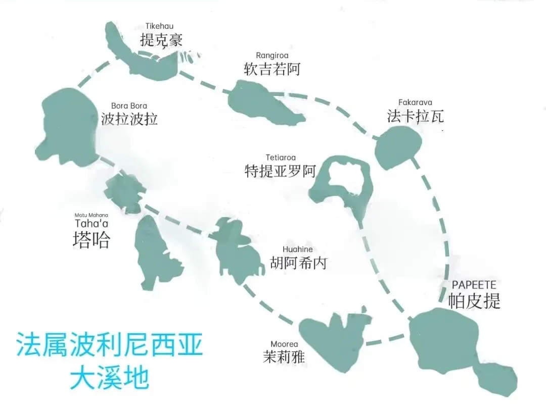 如上图,在南太平洋的中间地带,拥有着众多的顶级度假海岛,而在最东侧便是大溪地,严格的来讲,是叫:法属波利尼西亚。 法属波利尼西亚(French Polynesia),是一个由118个岛屿组成的地区,这些岛屿分布在5个群岛中,顾名思义,是属于法国的地区。 而法属波利尼西亚群岛里最大的岛屿,也是群岛的主岛和中心叫大溪地(Tahiti)。 在旅行(游)中所谓的传说中的王者大溪地,严格意义上并不是指大溪地岛,同马尔代夫的叫法一样,而是指大溪地岛周围的许多个度假海岛(如下图,为主要度假岛)。