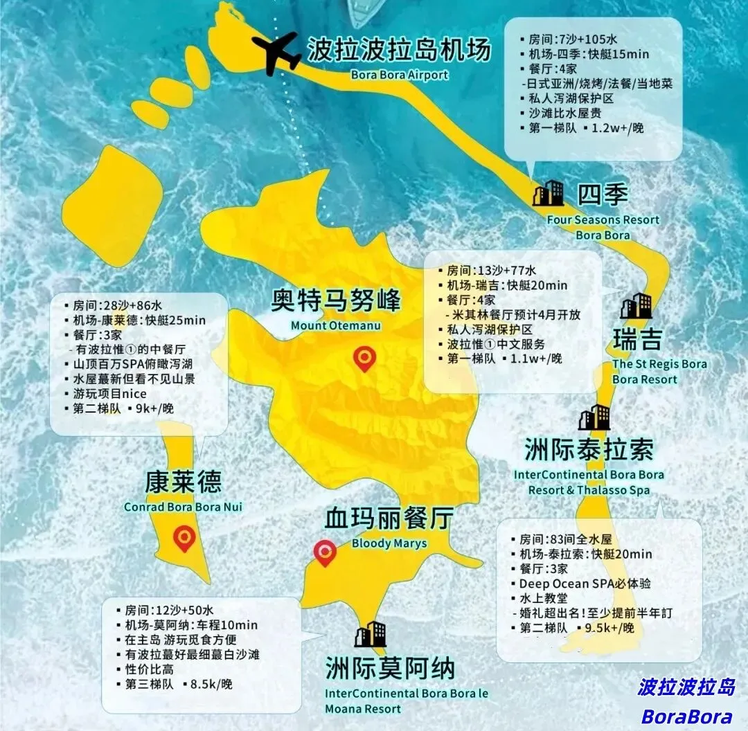 波拉波拉四季度假酒店 (Four Seasons Resort Bora Bora): - 四季度假酒店是大溪地比较老牌的度假酒店,服务可圈可点,有会中文的员工,对中文住客友好。 - 酒店共有100个套房,所有水屋都面向神峰,拥有精致的园林景观。 波拉波拉努伊康莱德度假酒店 (Conrad Bora Bora Nui)等其他酒店: - 其他酒店除了奥特马努峰景观略偏之外,也是不错的选择,也是性价比之选。