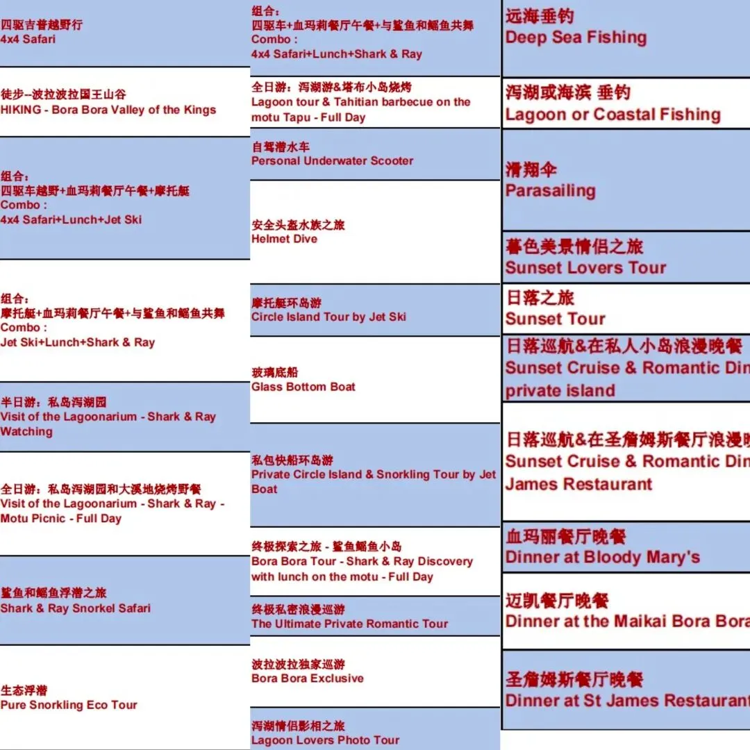 乘船出海浮潜:水非常清澈,浅水处魔鬼鱼和小鲨鱼在腿边游荡;而深海处则成群的大鲨鱼在脚下绕圈,非常震撼! 跳伞:跳伞最顶级的天花板,景色最美! 直升机:老少皆宜的奢华体验,俯瞰波拉波拉岛全貌! 酒店内娱乐:本身在酒店发呆,享受美景就已经是一种享受,晚餐还会有篝火土著舞蹈表演等活动。