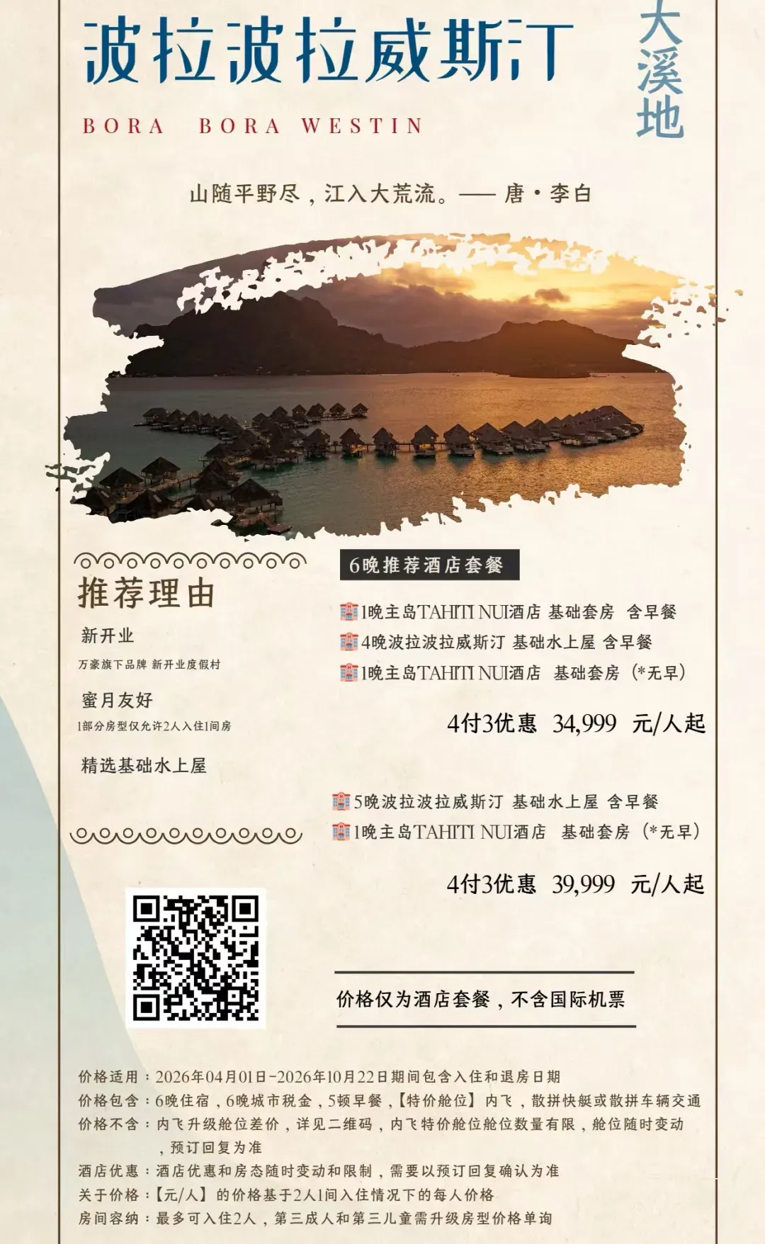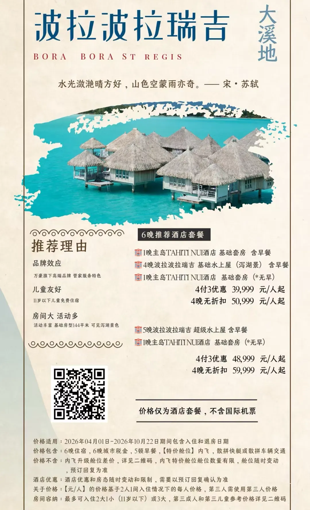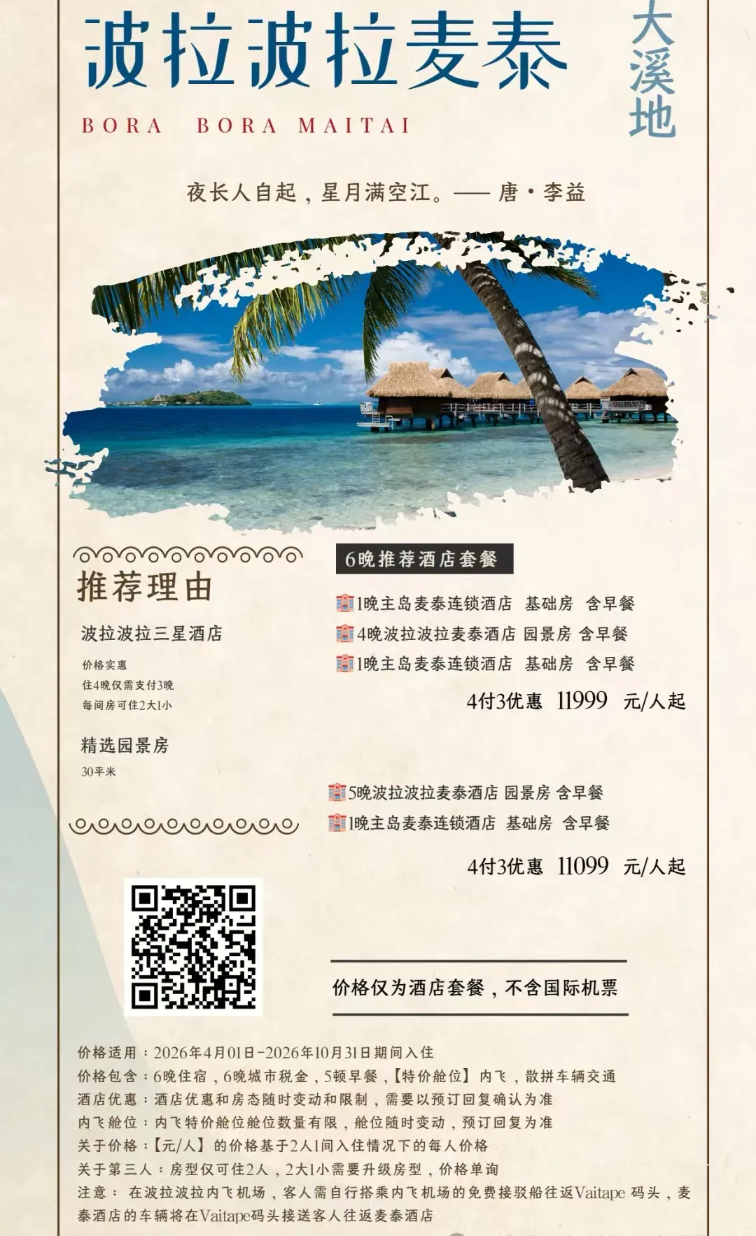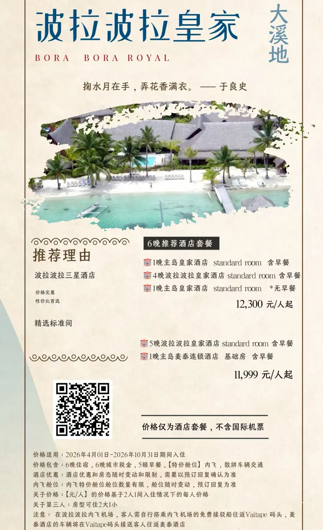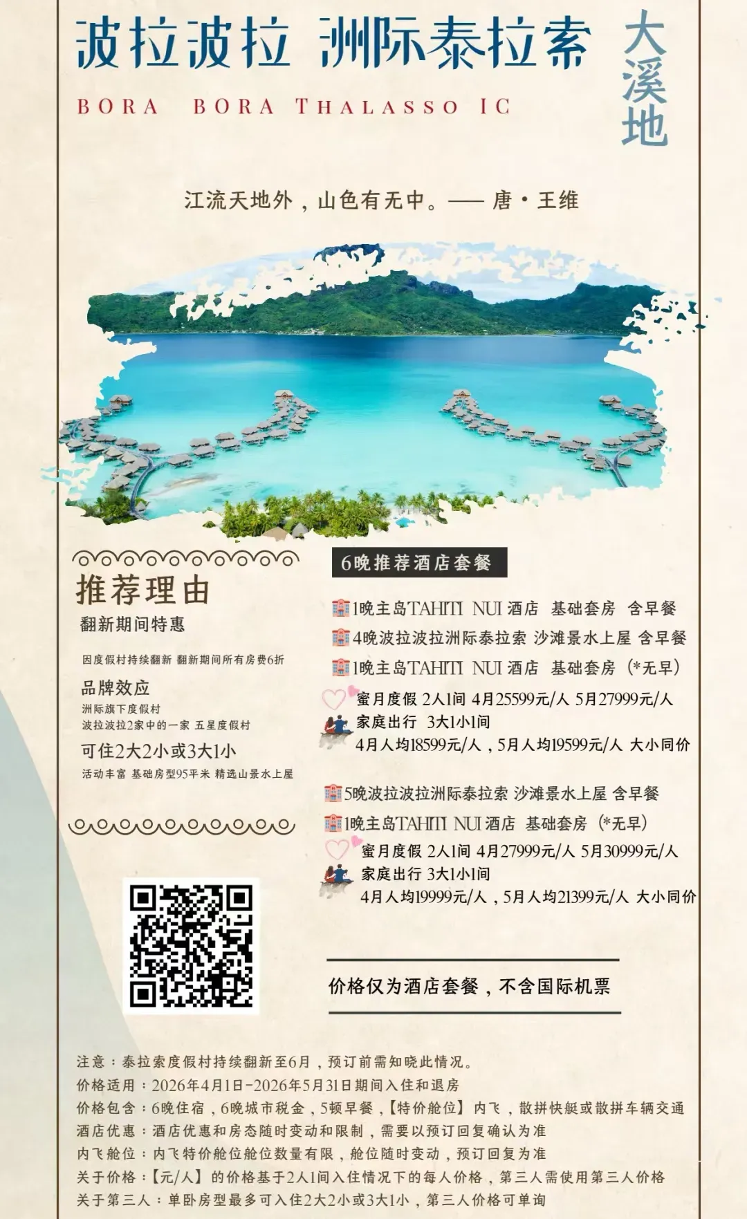 除此之外,茉莉雅岛,帕皮提岛也都有不错的海景和度假酒店,你可以结合自己的预算和行程,在转机日(飞波拉波拉需要在帕皮提转机;飞白兰度可以从茉莉雅转机)选择住一晚,进行体验。 关于我们 我们与大溪地官方指定旅行社为您推荐促销套餐,此外,我们同样也有其他顶级海岛度假促销套餐,感兴趣的朋友欢迎添加客服进行咨询,预订。