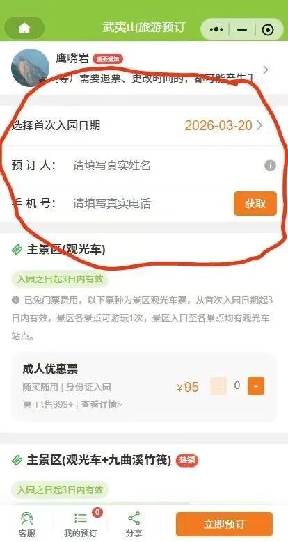 打开「武夷山游玩」小程序 → 首页填写入园日期,预订人,手机号