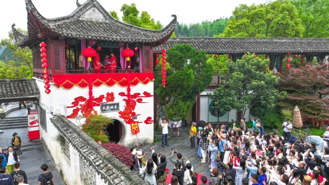 沉浸式体验徽州民俗婚嫁,围观热闹抛绣球仪式。