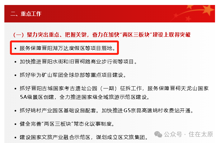 拥有如此多文旅优势的晋阳湖最近又有新消息传来!根据2024年晋源区政府工作报告中提到:服务保障晋阳湖万达度假区等项目落地。