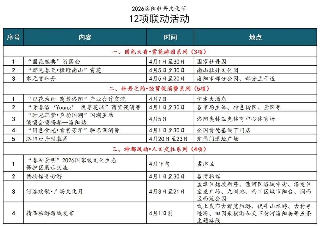 您现在的位置是:首页 > 国内旅游目的推荐 > 正文 国内旅游目的推荐 旅游攻略|2026洛阳牡丹文化节活动安排表 admin2026年03月27日 18:17:53国内旅游目的推荐1 旅游攻略|2026洛阳牡丹文化节活动安排表2026年3月16日,河南省政府新闻办举行第43届中国洛阳牡丹文化节新闻发布会,宣布2026年洛阳牡丹文化节将于4月1日至4月30日举行。今年的牡丹文化节以“一路繁花向洛阳”为主题,以“牡丹为媒、文化搭台、经贸促消”为方向,9项主体活动、12项联动活动,解锁沉浸式赏花、国风体验、产业交流等多元玩法。 根据公开资料编辑整理,今年(第43届)牡丹文化节活动(9项主体活动+12项联动活动)安排表来了,或许你用得着,敬请收藏。#洛阳旅游#牡丹花会#牡丹花#牡丹园#牡丹#洛阳旅游#旅游攻略#牡丹文化节图文来源洛阳旅游微信公众号 如有侵权请联系删除,了解更多旅游线路,请关注我们的公众号“洛阳旅游直通车 转载请说明来源于"旅荐网",部分内容转载自网络,如有侵权请联系qlwl@foxmail.com删除 本文地址:https://www.15386.cn/post/149731.html 上一篇 杭州春日旅行攻略|西湖赏花,赴西湖之约 相关文章 杭州春日旅行攻略|西湖赏花,赴西湖之约 武隆长坝镇乡村旅游发展有新规划 丽江保姆级旅游攻略!交通-住宿-路线-美食,一篇全搞定 五人自驾青海22天花2.5万,路线攻略建议收藏 出国旅游英语全指南 诚邀各界加入中国旅游协会生态旅游分会 新疆旅游攻略——阿勒泰 国庆游玩指南!这份文山各地文旅活动合集送给你 【高薪设计】武汉,管道工程师!03月27日更新 3-4月游玩指南!7个舒适小城,说走就走! 发表评论 取消回复 评论列表 这篇文章还没有收到评论,赶紧来抢沙发吧~