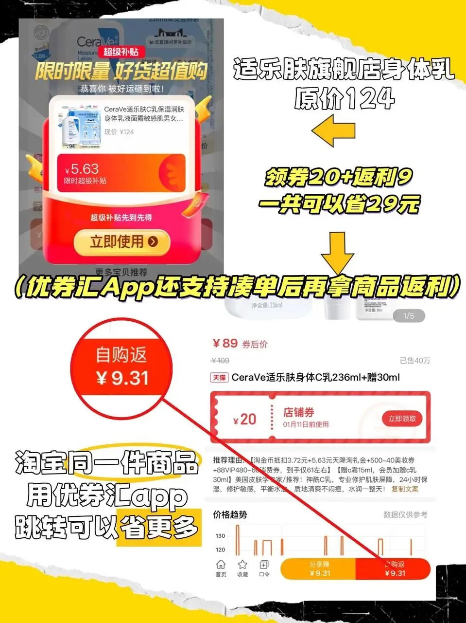 第二,能找到淘宝隐藏优惠券。很多优惠券在淘宝页面根本看不到,但优券汇能搜出来。上周买了瓶身体乳,原价124,搜到20块券+返利9块,省了29💰