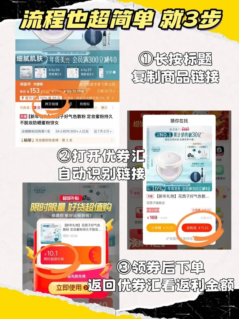 「复制链接 → 打开优券汇 → 一键领券下单」