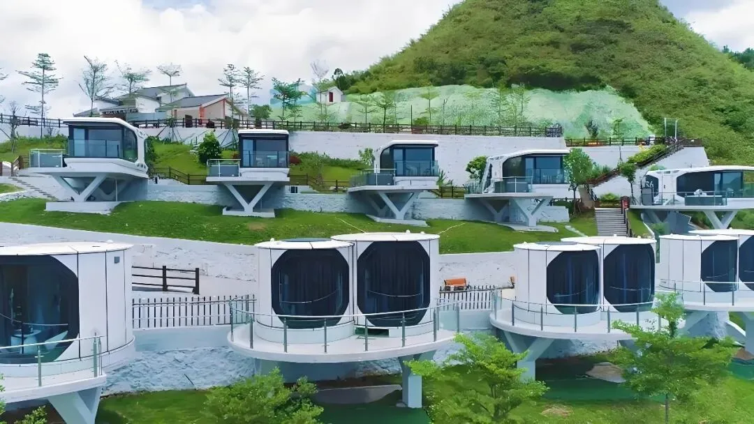 这里分为两大区域:摘星营地拥有 16 个太空舱客房,可登顶云端,俯瞰群山大河,尽览湖库壮阔风光;山语片区则有 37 栋森林木屋,涵盖 V 屋、家庭屋等 5 种特色房型,还配套无动力儿童乐园、森林咖啡屋与观光餐厅。