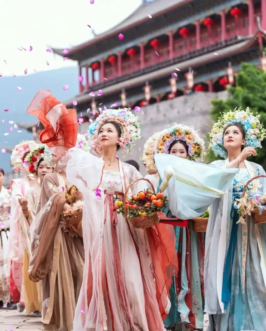 👘 汉服穿搭建议今年流行“花神妆”——额头画花钿,发髻插鲜花。唐制齐胸襦裙适合桃花林,宋制对襟长衫适合油菜花田。