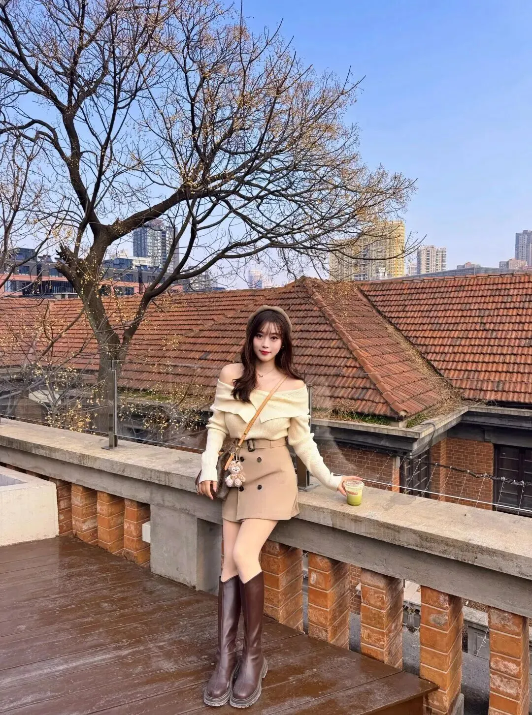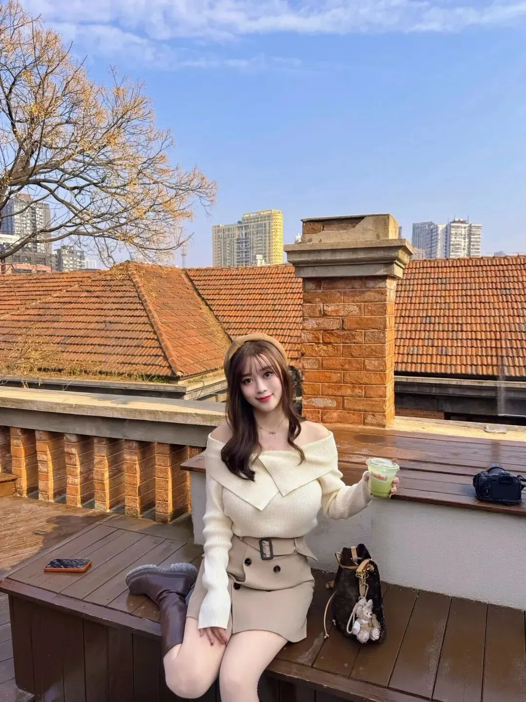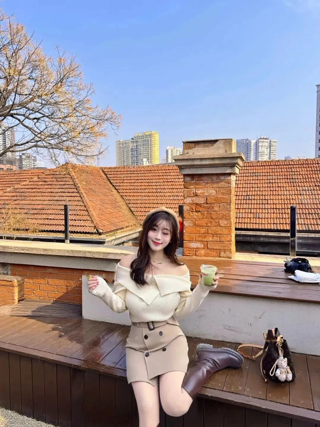 配饰不可掉以轻心。戴了一顶浅卡其色的贝雷帽,立刻有了几分法式优雅的韵味,复古的气息扑面而来。头发是大波浪型长发,深棕色,垂在肩上,和帽子一起,柔美甜润。项链是由一根细细长长的链子和一条短小圆润的小链子组成的,简单大方,在化妆品中起到点缀的作用。包包选的是深棕色老花水桶包,容量大,有复古的时尚感。包上面挂了一个浅棕色毛绒小熊,很可爱、调皮地给整个造型加上了色彩。