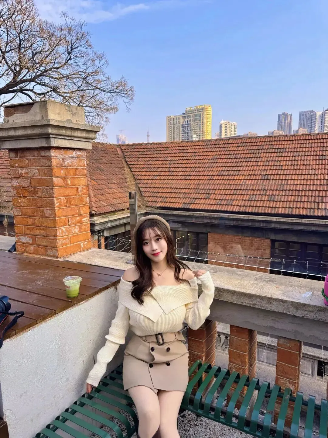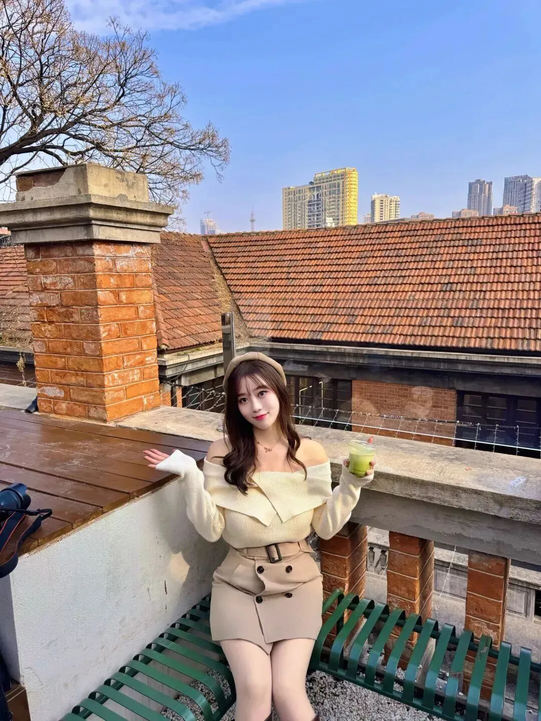 穿上好看的衣服,拍出好看的照片姿势。试问甜美微笑杀,对着镜头甜甜一笑,眼睛亮晶晶的,有很强的感染力。右手轻轻搁在旁边的木台上,左手端一杯绿色的饮料,在享受当中慢慢放松下来。