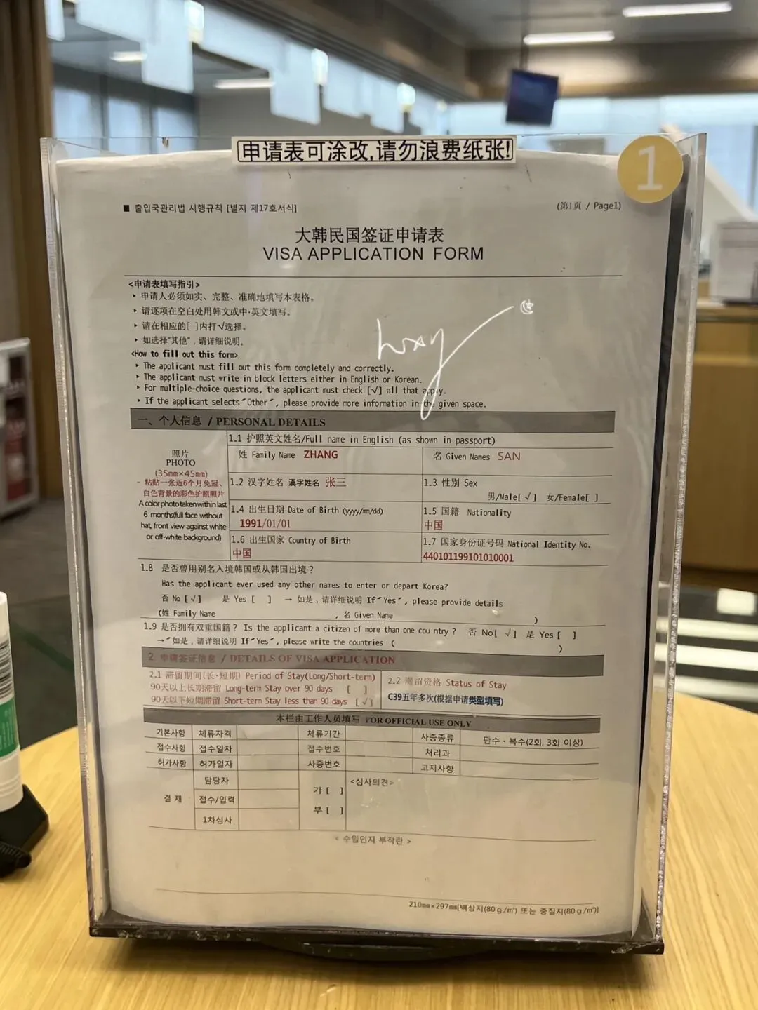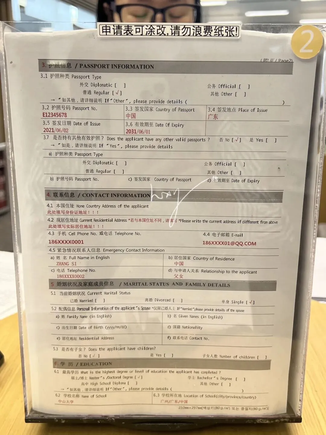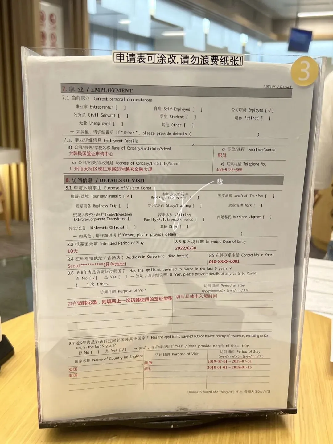 4.到14楼后往右边走,现场会有工作人员预先让人填资料,填资料现场有模板,照着填写就行了。填完资料后再给刚刚那个工作人员检查填写的资料,无误后取号。 现场的申请表填写模板右上角有数字1-2-3,按着顺序填写就行了。记得要自己打印空白申请表带去填。