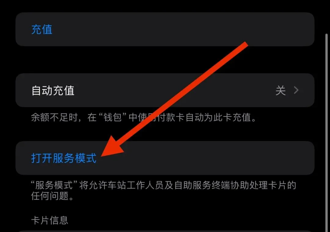 5.充完后,去钱包这张卡的位置点击卡片详情信息里面打开服务模式,在线下机器上充值也需要打开服务模式。