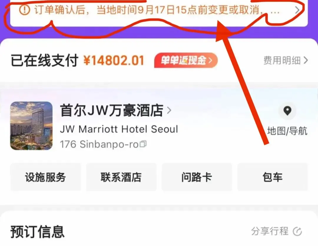 8️⃣往返机票 9️⃣酒店预订单 🔟行李 这三个内容,后面内容及会说。 机票行程单和酒店预定单我都打印了,方便后续使用,也是后面的内容会说到。 个人旅游行程记录 我对旅游的态度: 问我旅游,那就是哪都想去。 问我攻略,那就是什么都没有。 我是完全不做旅游计划和攻略的那类p人,习惯性到了再说的行事风格。也有时候会想做,但经常刚打开随意看了两篇攻略就会放弃,同质化太严重,没什么参考价值就不想看。然后又因为没去过,哪都想去看看走走,要去多久我也没有时间概念,玩多久去哪儿玩,问我我是完全不知道的,而且也不会计划,是到了再说的那种佛人。没有网红必打卡的心态,也不想去网红的机位打卡,主打的就是一个随心所欲,走到哪儿玩到哪儿。 但这次韩国游的方式: 我负责一切,我老公负责当弱智陪跑 这是我第一次做旅游行程。 感叹作为p人做旅游计划实在是太难了,没到极限时间我根本搞定不了,距离出发还有六七天的时候才搞定了机酒两大核心。 我自己一人订机酒的经历,一些小历程分享: 酒店我订的是首尔JW万豪酒店。 我对住宿要求高,所以在住宿上很大方,选当地的万豪酒店就行了,很快就能订完酒店。选万豪还能积分,当时订这个酒店的时候万豪官方没房了,第三方还有,所以我在第三方订了。(但这个也是侥幸,更多时候是官方没房了第三方也没了,这次还挺侥幸的)第三方订的有个注意点是变更/取消的手续费问题,我就没注意这个问题,下单后变更和取消都不方便。 我下单时候的没看到这黄色部分小字。导致变更取消/都要手续费了。🤦🏻♀️