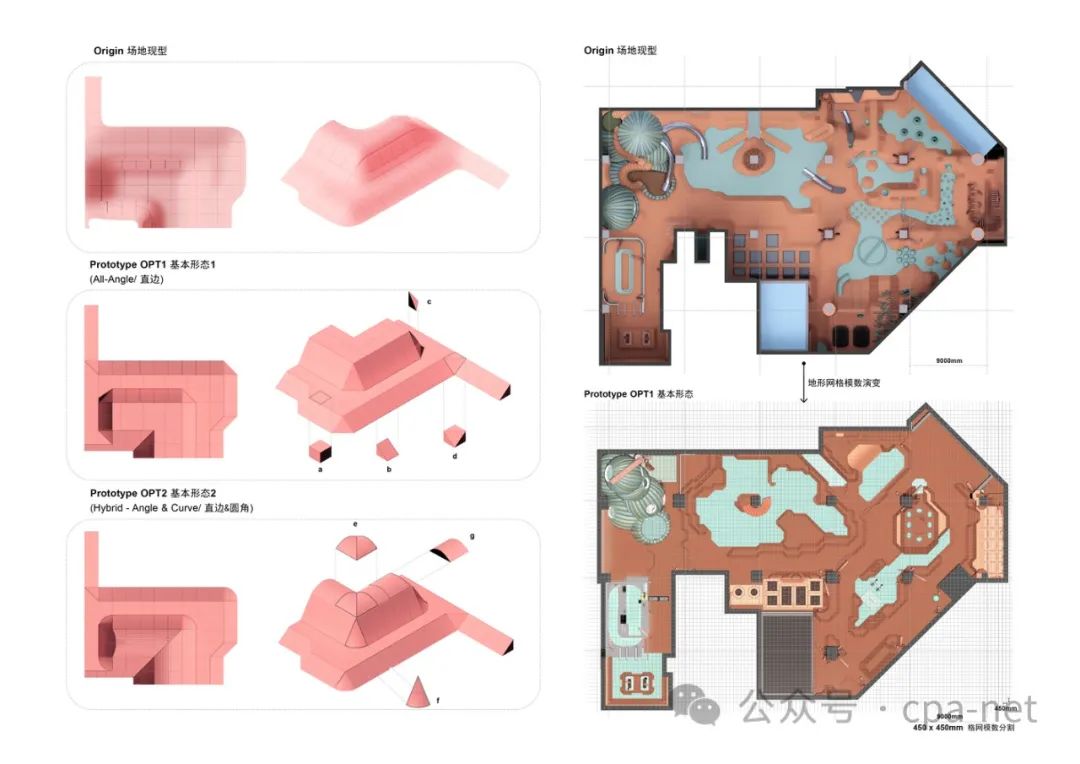 地形:场地地板的整体地形设计为类似于沙丘。我们使用尺寸为 450x450 毫米的梯形标准块抽象出沙丘的形状。通过三维堆叠和排列这些标准模块,地面已经变成了一个基本的物理障碍训练区。结合不同形态的仙人掌形成的空心和高架区域,打造出一个完整的运动场馆。