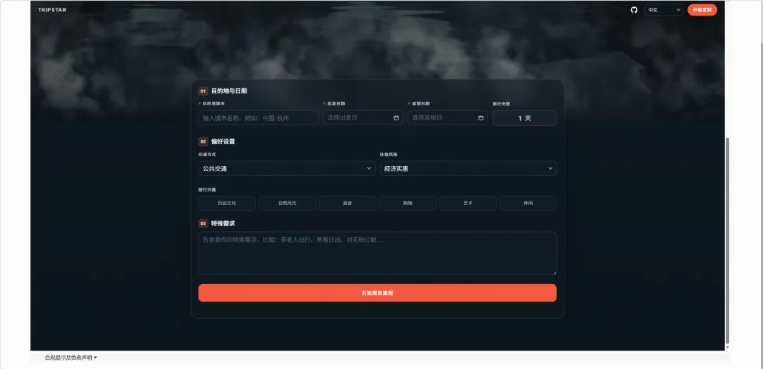 :项目说明中明确目前主要支持国内旅行场景,复杂的跨境多国行程暂不支持。若你不想折腾前后端环境以及各种 API Key,直接使用现成的在线 AI 工具通常更为省事,无需费力进行本地部署。