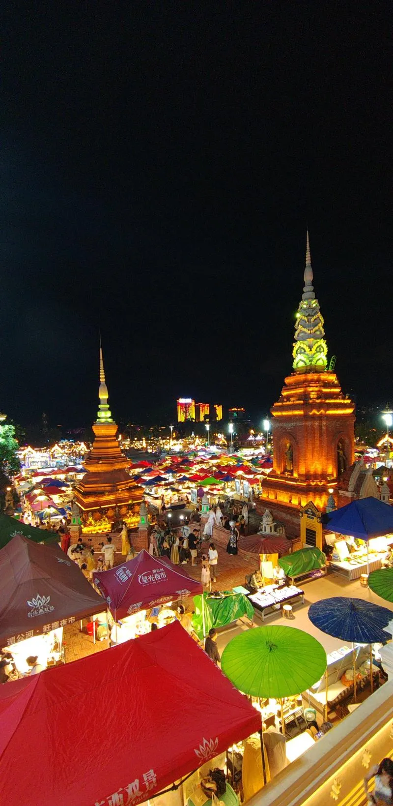 先说市区,告庄西双景是必须住的,不是因为它有多好,是因为它把西双版纳的市井气和旅游气混得最均匀,你白天可以在星光夜市逛逛,看看那些卖傣族服饰、银器、木雕的小摊,晚上夜市一开,整个告庄就变成了一个超大型的露天美食街,烤鱼、烤鸡脚、菠萝饭、舂鸡脚,你想吃的傣味这里基本都有,价格也不算离谱,关键是氛围好,那种热闹劲儿是真实的,不是刻意营造出来的。