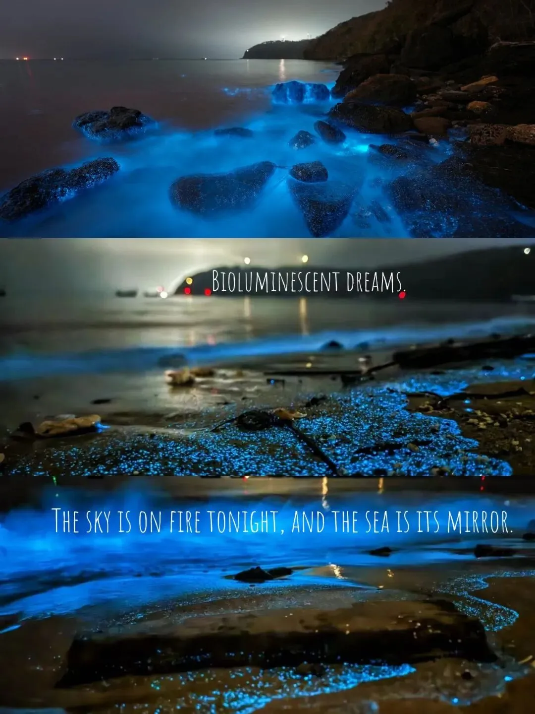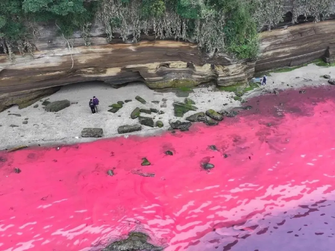发光藻白天化身为粉色赤潮,汲取阳光与养分,当夜幕降临,在海浪轻轻拍打、扰动之下,便会绽放出幽蓝梦幻的荧光,宛如整片星河坠入海面,温柔又震撼。