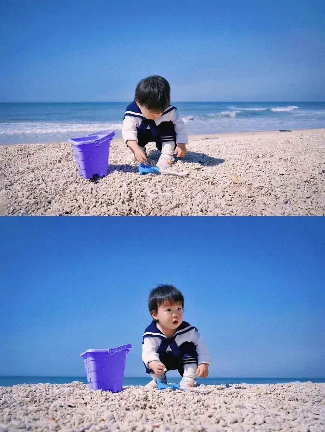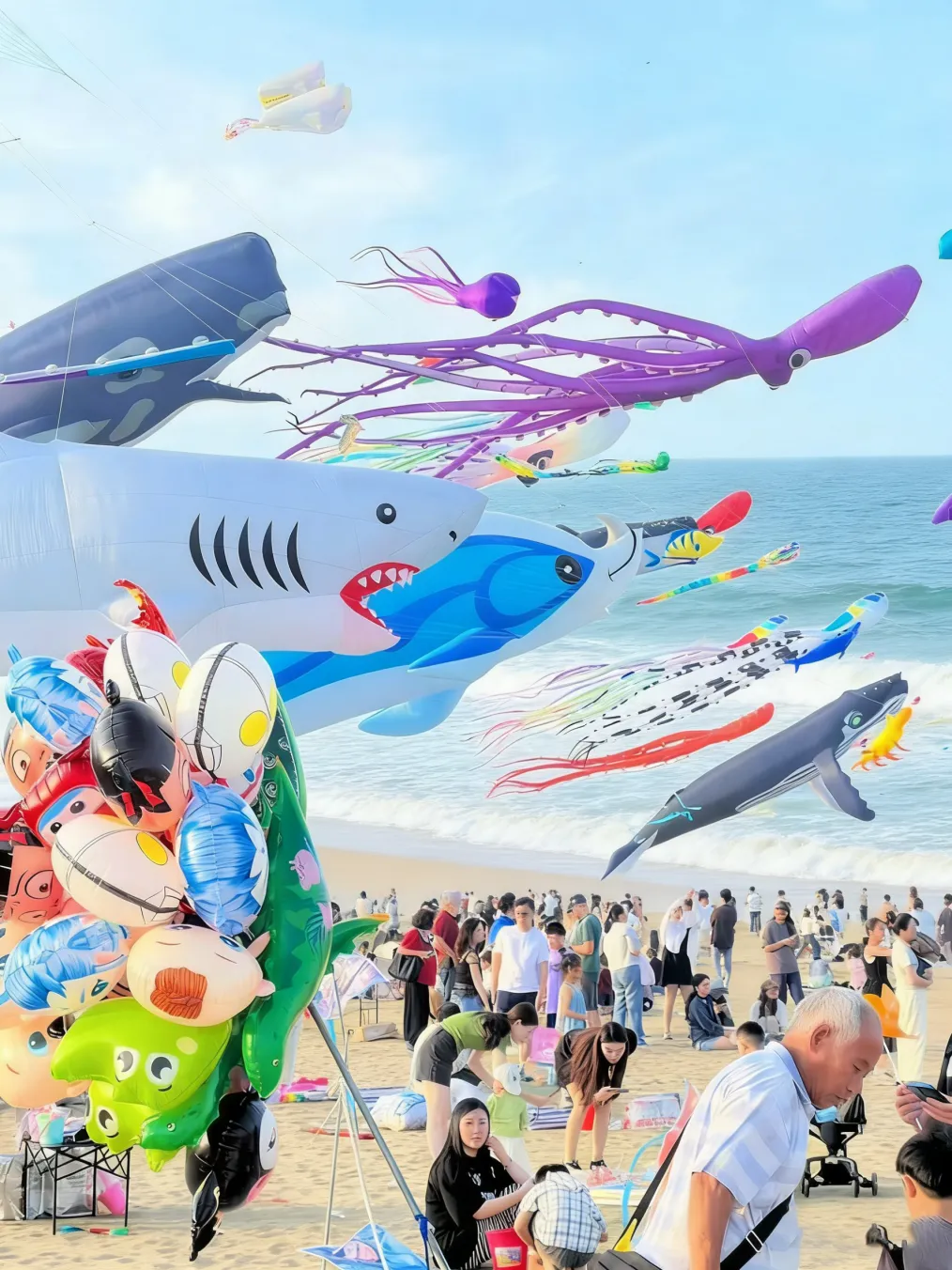 白天带娃放飞纸鸢,各式各样的风筝在蓝天自在翱翔,海天一色间,仿佛大海与天空倒置而来。
