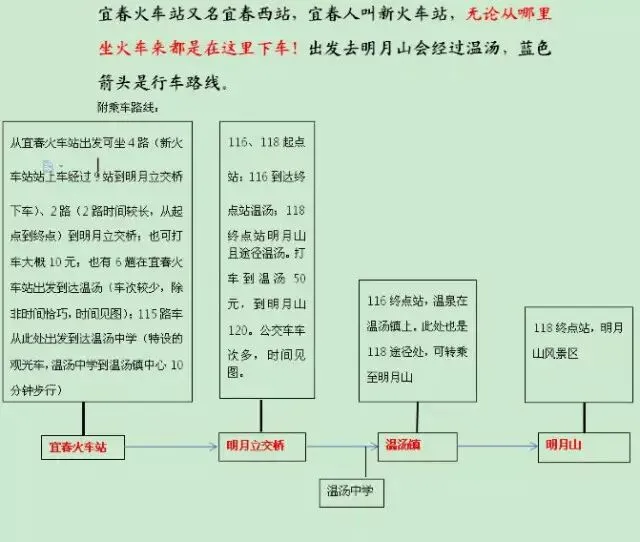 交通路线 宜春交通便利,飞机高铁都有直达。 城区公交:宜春火车站乘坐115双层旅游大巴至终点站温汤中学,原站台转118路公交车至终点站明月山景区。其他公交转乘可见下图。