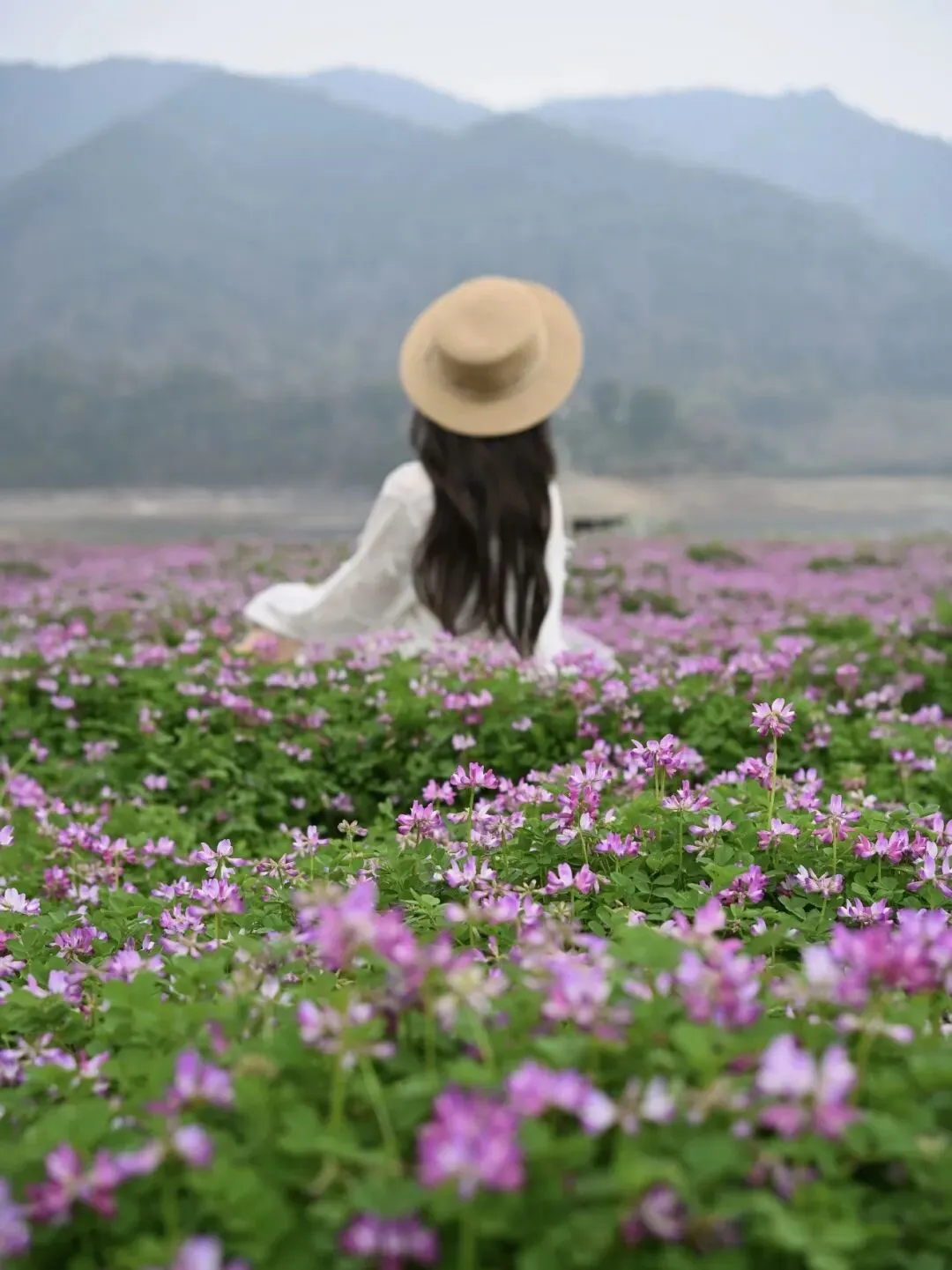 成片紫云英紧贴水岸盛放,晴空之下,紫花映着碧水,远山衬着繁花,这片花海自带开阔草坪,是绝佳的野餐露营地。铺块餐布,晒着暖阳、闻着花香,不管是全家散心、好友小聚,还是独处发呆都合适。