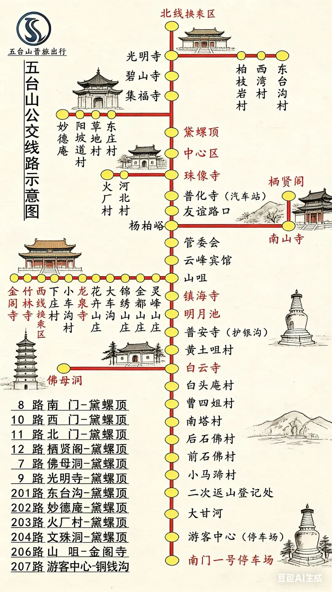 🚇11路(北线换乘区 ↔ 黛螺顶) 🚇12路(栖贤阁 ↔ 黛螺顶) 🚇9路(黛螺顶 ↔ 光明寺) ✅ 优先坐8路:覆盖全面、班次密集,堪称“万能线”,新手闭眼选 ✅ 夜间出行:8路/10路/11路有夜班,30分钟/班,安全又省钱 ✅ 台顶交通:景区公交不到台顶,需在黛螺顶/游客中心换乘