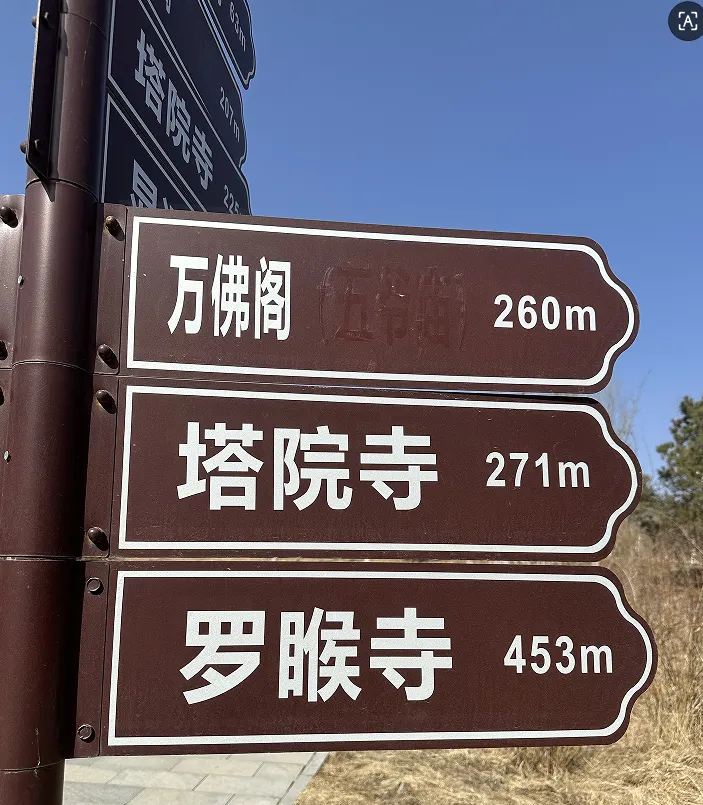 像我这次出行,见寺庙就拜,一天半足够了。当然这也得看人多不多。如果时间紧张,一天也是够的。热门寺庙都很集中,步行即达。以下是我从殊像寺出来去往五爷庙的路上拍下的路标指示牌,是不是都很近?所以第一次去的朋友,不用担心,不会迷路。只要你钱带够了,手机电满格,真的不用害怕。