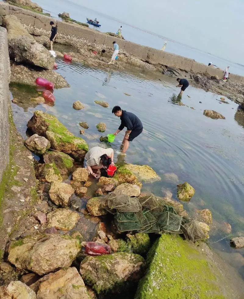 赶海这个活动听起来挺土的,但真去体验一次你会发现,这事儿其实挺有意思,退潮之后,海滩上会露出很多礁石和水坑,里面藏着小螃蟹、海螺、海星,你拿个小桶、一把小铲子,在礁石缝里翻翻找找,每找到一个都跟中了奖似的,赶海这件事让城市人重新体验了一把靠自己动手获取食物的感觉,虽然最后那点收获根本不够吃,但那种满足感是在超市买海鲜永远体会不到的。