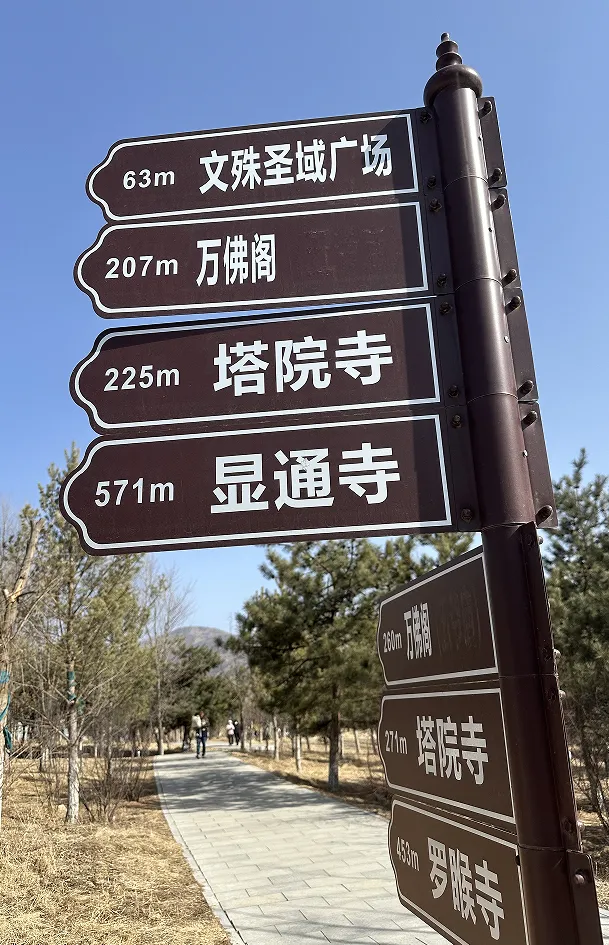 像我这次出行,见寺庙就拜,一天半足够了。当然这也得看人多不多。如果时间紧张,一天也是够的。热门寺庙都很集中,步行即达。以下是我从殊像寺出来去往五爷庙的路上拍下的路标指示牌,是不是都很近?所以第一次去的朋友,不用担心,不会迷路。只要你钱带够了,手机电满格,真的不用害怕。