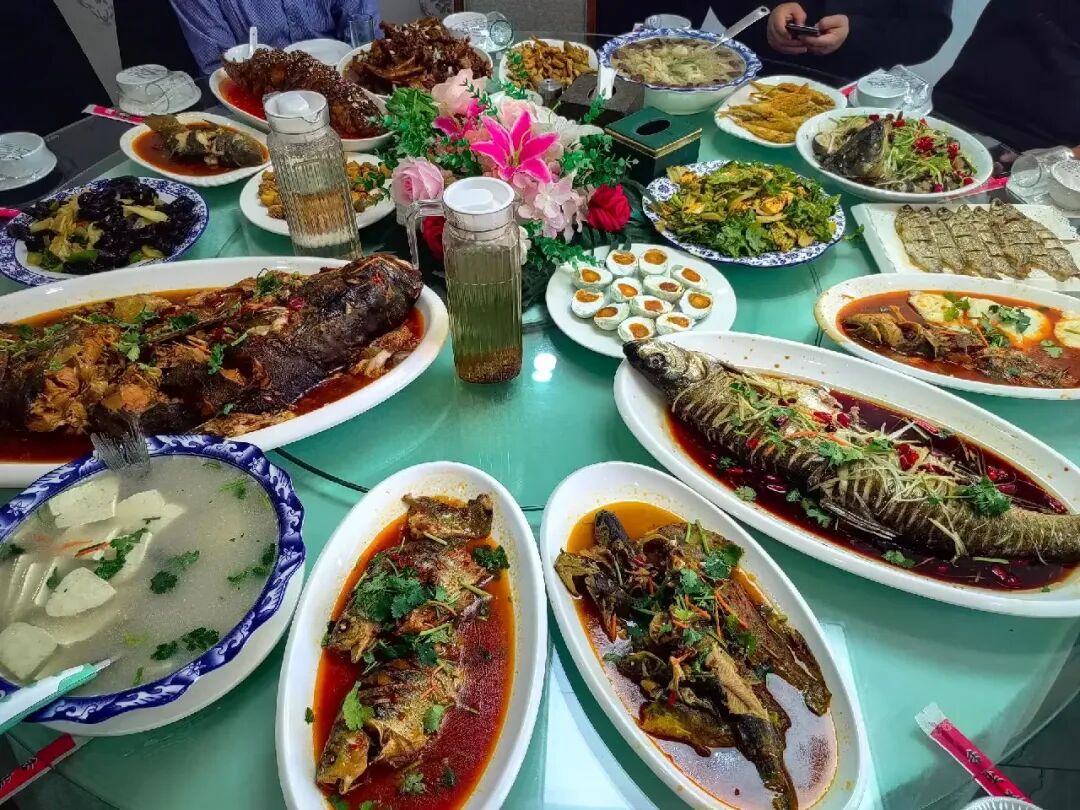 这道小吃名字里带"肉",实则与肉无关,是用豆腐皮腌制而成的。它是益阳的"国民零食",也是游客必买的伴手礼。麻辣肉呈长条状,色泽红亮,油润干香。入口先是浓郁的酱香,随后是辣椒和香料的复合香味,口感柔韧有嚼劲,越嚼越香。虽然叫"麻辣",但更多的是香辣,那种独特的余味让人欲罢不能,是益阳人从小吃到大的味道。 3. 全鱼席:洞庭湖的"鲜"味盛宴