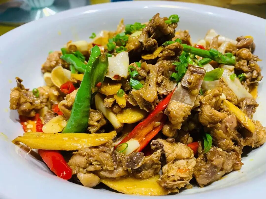 安化腊肉是益阳的"非遗"美食,也是湘味腊肉的代表之一。选用本地土猪,用松柏枝、茶壳等材料慢熏而成。成品色泽黄亮,烟熏味浓,咸香可口。无论是蒸食、炒菜还是煮汤,都是一道硬菜。特别是安化腊肉炒藠头,藠头的酸爽与腊肉的咸香相得益彰,可以说是益阳人最爱的家常菜之一。 6. 茶油炒土鸡:山野风味的"金黄"诱惑