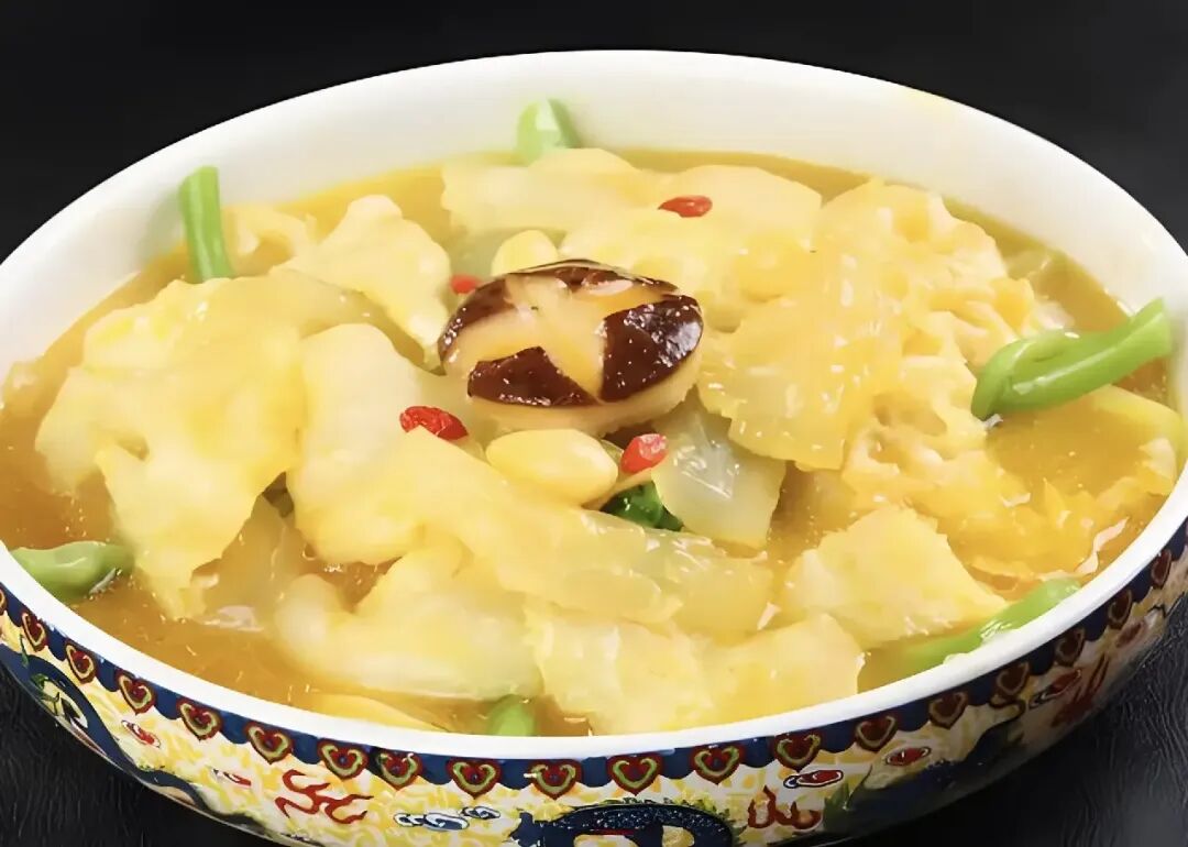 益阳盛产茶油,用茶油炒制的安化土鸡是一道极具地方特色的硬菜。土鸡肉质紧实,茶油香气浓郁。炒制过程中,茶油的清香渗透进鸡肉的每一丝纤维,色泽金黄诱人。鸡肉鲜嫩中带着嚼劲,口感油润而不腻,是滋补身体的佳品。 7. 三鲜笔架鱼肚:鱼肚界的"形色"双绝