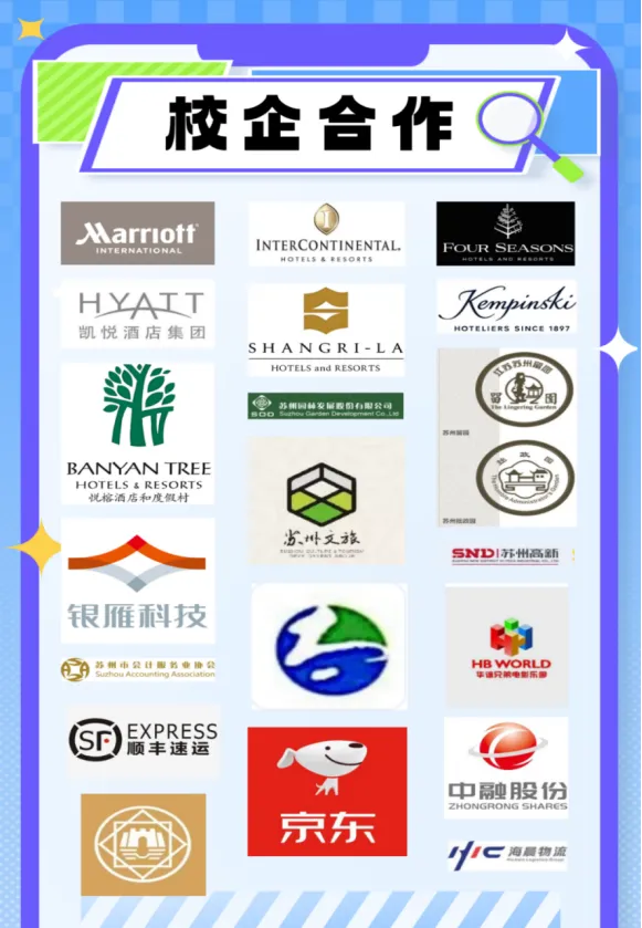 学院深度整合文旅产业资源,构建"本土龙头+国际名企"双轨协同机制。联合苏州文旅集团、苏州园林集团、苏州太湖国家旅游度假区管委会等政府与本土龙头企业,共建课程开发与师资共享机制;携手万豪、凯悦、顺丰等世界500强企业及相关行业协会,打造覆盖酒店管理、智慧物流等领域的校外实训基地矩阵。