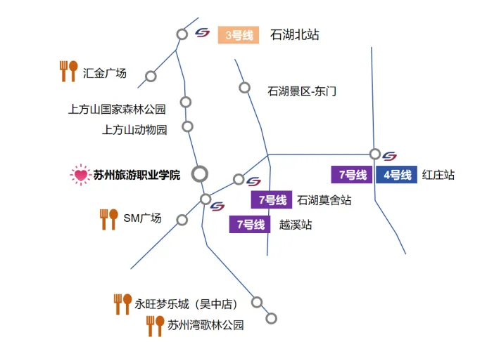 校园周边生活便捷,步行10分钟就是教育园商业中心,餐饮店、便利店、健身房、电影院应有尽有;骑行15分钟可到龙湖天街、万达广场等大型商圈;上方山景区、石湖景区就在附近,还有地铁直达古城区。
