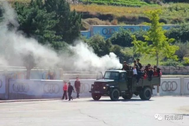 刚到开城市区,我们就见到一辆卡车。因为卡车冒着滚滚浓烟,我以为是着火了,看到卡车后面站在很多孩子,我开始还有些担心。后来才知道,这种卡车叫木炭车,因为烧木炭驱动,所以会冒烟,并不是着火了。