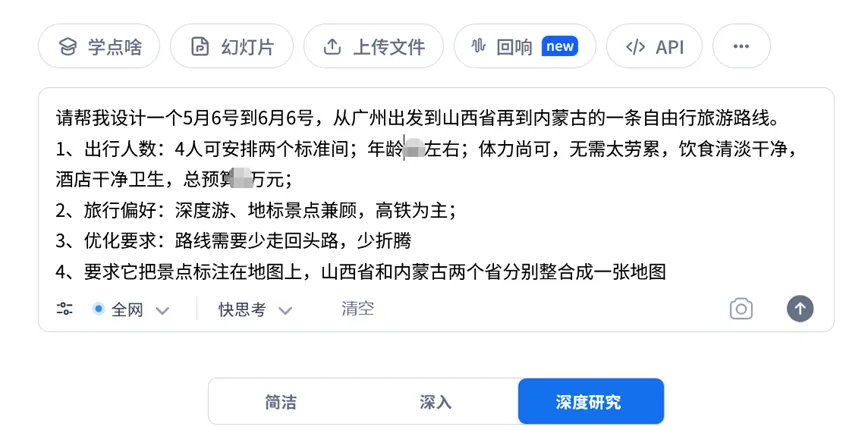 2、限定边界:告诉它你的旅行时间段、旅行天数、出行人员、体力情况、饮食偏好和预算大概是多少