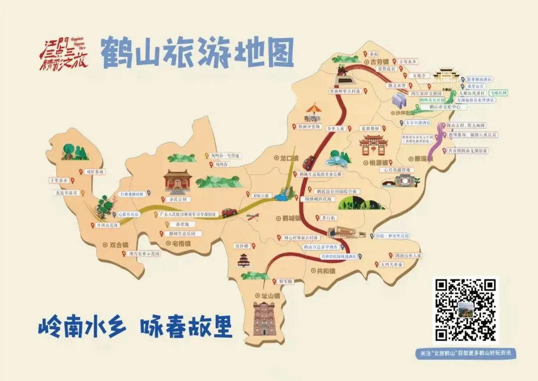 路线特色:玩遍鹤山各镇(街),水乡风情、山林野趣、红色研学、茶园体验、客家美食一网打尽。