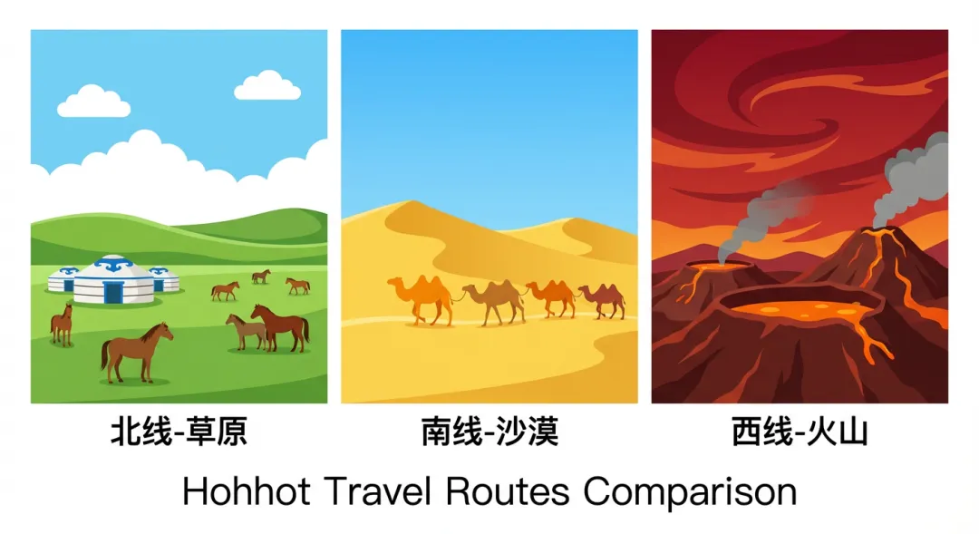 内蒙古旅游不是一条线路走到底,而是以呼和浩特为大本营,分三个方向辐射。 北线:草原方向 南线:沙漠方向 西线:火山方向 02 排景点——按天数组合路线