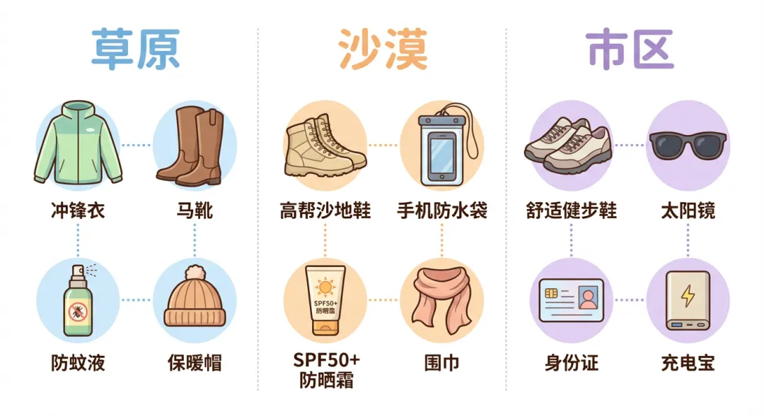 必带清单 :防晒霜(SPF50+,每2-3小时补涂)、太阳镜、宽檐帽、冲锋衣或薄外套(草原昼夜温差10-15°C)、防沙鞋或运动鞋(沙漠用)、润唇膏和保湿面霜(气候干燥)、驱蚊液(夏季草原蚊虫多)。