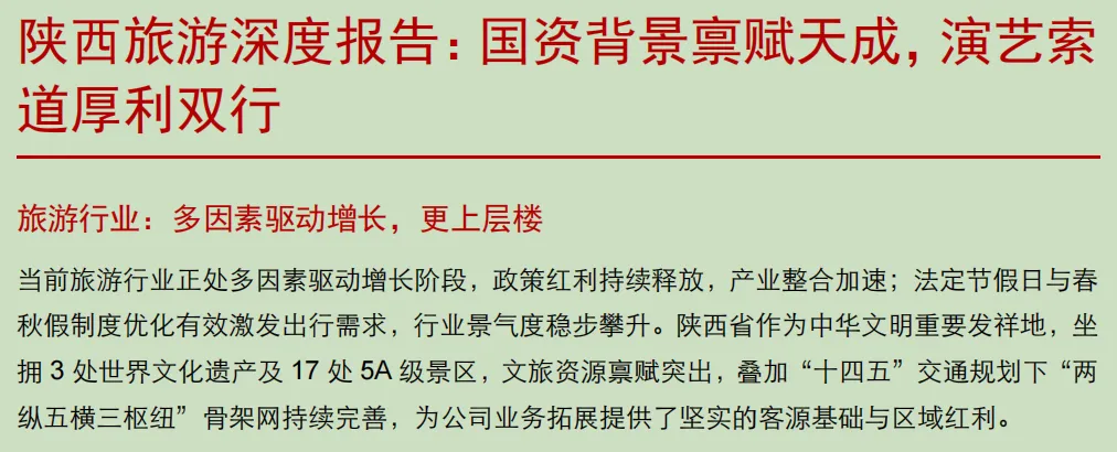 政策与供给双擎: 国家出台多项提振服务消费的政策,叠加2025年起法定节假日增加2天,以及春秋假的推广,有效激发了旅游需求。 区域禀赋优越: 陕西省作为中华文明发祥地,坐拥众多世界文化遗产和5A景区,同时高铁、航空等交通网络的完善,为当地旅游业提供了坚实的客源基础。