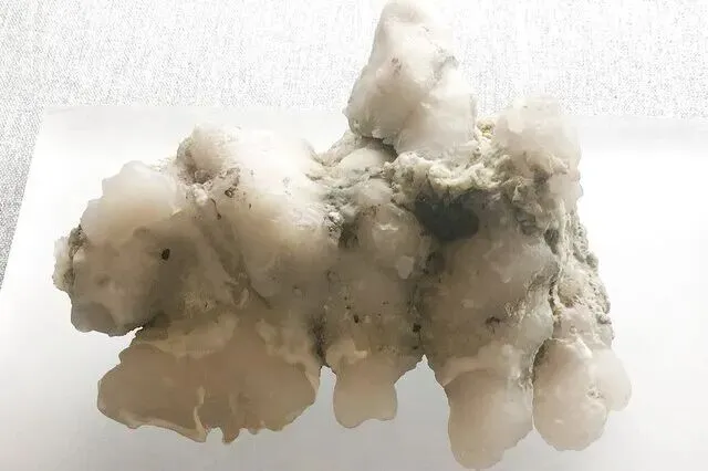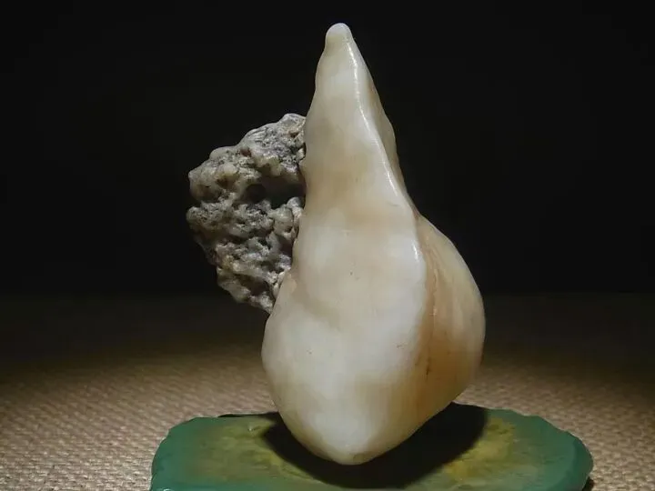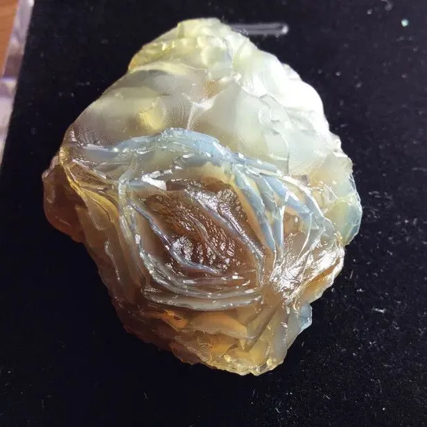 产地:哈密、吐鲁番火山岩区。特征:非晶质二氧化硅,温润似蛋白,半透明至微透明;有单色(白/灰)和五彩(欧泊质);与火山热液有关。
